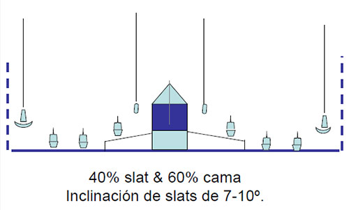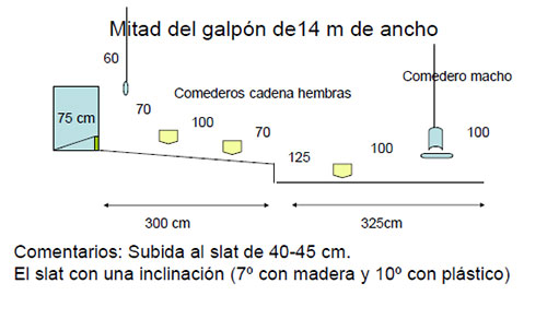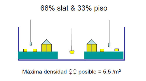 Los slats deben tener aperturas rectangulares cuando sean de plástico, aunque es mejor usar slats de madera. Es importante la altura de los slats y su inclinación debe estar entre 7 y 10 grados. Una línea de comederos se debe poner sobre los slats.
