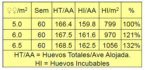 Los resultados de varios años de pruebas demuestran que subir la densidad de las gallinas de 5.5 por metro cuadrado (m2) a 8 por m2 mejora la producción de huevo incubable por un 45%. Más huevo incubable resulta en más pollitos nacidos por parvada.