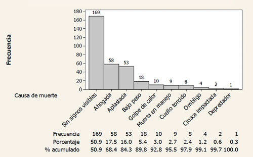 Las tres primeras causas de mortalidad natural acumulan 84.4 %, del cual el 33.5 % son causas (ahogadas y aplastadas) que pueden disminuirse con el manejo de bebederos adaptados para evitar que queden atrapadas en el abastecedor, la siguiente causa puede reducirse con mayor cuidado al colocar el bebedero, mover el comedero y la cama.