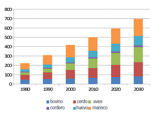 Demanda mundial por proteína 1980-2030 (millones de toneladas)