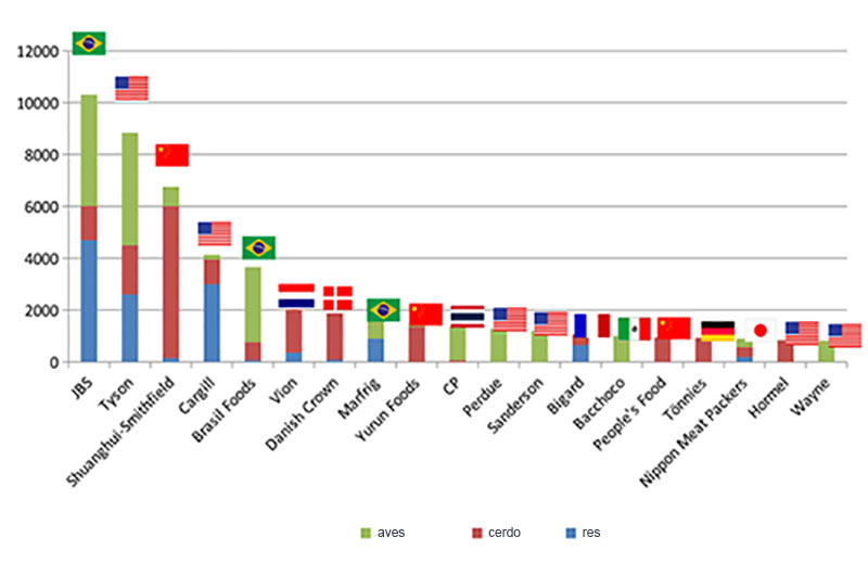 Las empresas cárnicas de EUA y Brasil dominan, concretamente Tyson en EUA y JBS en Brasil.