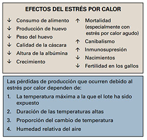 Los períodos de temperaturas ambientales altas, a menudo producen una alta humedad relativa, esto ocurre generalmente durante los meses de verano. El estrés por calor puede afectar profundamente la productividad de un lote. A temperaturas ambientales de más de 33°C, la alta mortalidad y las grandes pérdidas de producción son evidentes, pero a temperaturas menos extremas, a menudo pasamos por alto el estrés por calor como la causa de mal crecimiento o de pérdidas en la producción de huevo y en la calidad de la cáscara.