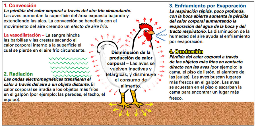 La radiación, convección y conducción juntas se conocen como pérdida de calor sensible. La zona termoneutral del ave generalmente es entre 18–25°C.