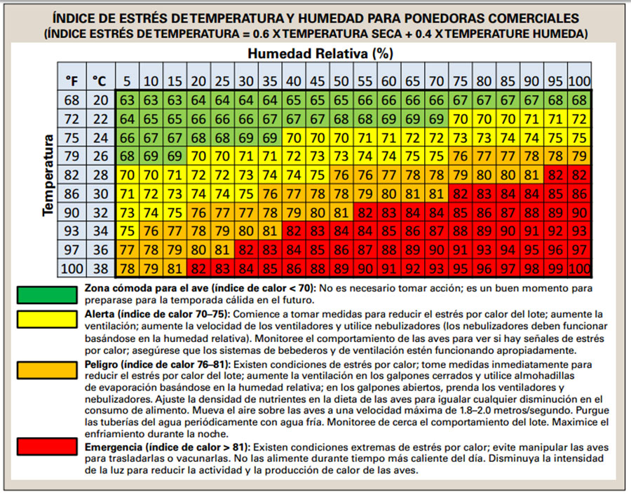 Durante la tarde cuando baja la temperatura, y típicamente aumenta la humedad, el uso de nebulizadores para aumentar la humedad puede aumentar el estrés por calor. Cuando la humedad es alta, utilice únicamente ventiladores para aumentar el movimiento del aire y reducir el estrés por calor en los galpones abiertos por los lados. El movimiento del aire produce un efecto de aire frío, y el cuerpo percibe una disminución de la temperatura debido al flujo del aire. Se ha desarrollado una tabla del índice de estrés térmico para ponedoras comerciales (Figura 2).