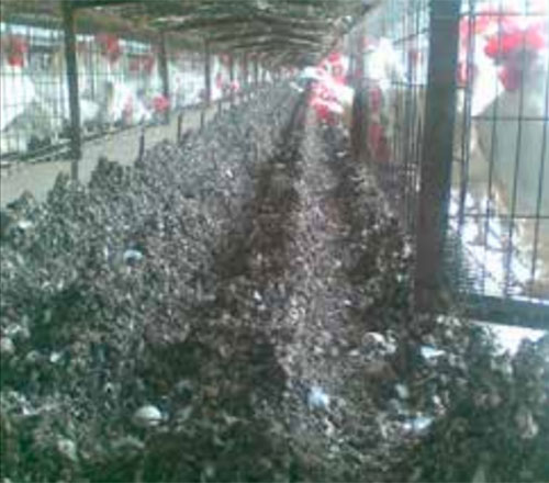 • Si es posible, saque la gallinaza de los galpones antes de la temporada de clima cálido. El calor producido durante la descomposición de la gallinaza contribuye a la carga de calor dentro del galpón. La presencia de grandes cantidades de gallinaza en los pozos con poca profundidad o debajo de las jaulas tipo batería restringen el movimiento del aire.