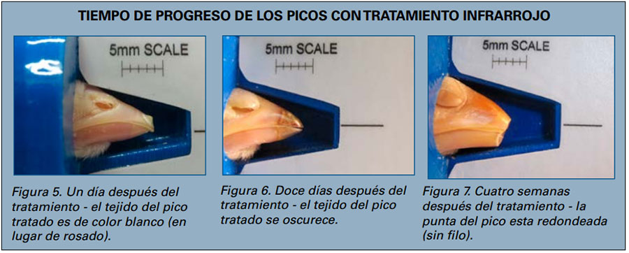 El pico tratado tarda aproximadamente dos semanas en caerse, y los cambios en el largo y en la forma del pico ocurren gradualmente, permitiendo que durante este tiempo las aves se acostumbren a comer y a beber (3).