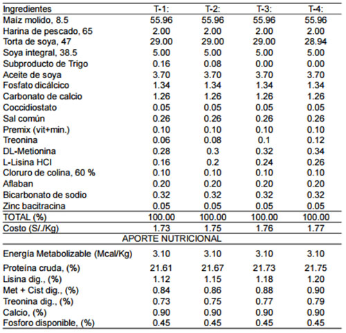 Tratamientos experimentales: T-1: 1.12% lisina dig, 0.84 met+cis dig y 0.73% treonina dig; T-2: 1.15% lisina dig, 0.86 met+cis dig y 0.75% treonina dig; T-3: 1.18% lisina dig, 0.88 met+cis dig y 0.77% treonina dig; T-4: 1.20% lisina dig, 0.90 met+cis dig y 0.79% treonina dig.
