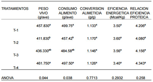 Las densidades de los aminoácidos de las dietas en estudio, afectaron significativamente el peso vivo y consumo de alimento de los pollos broilers de 0 a los 14 días de edad. El peso vivo de los pollitos que consumieron la dieta de mayor densidad de aminoácidos (T-4), fue significativamente (P<0.05) más alto (50 g) comparado al grupo de pollitos de mas bajo peso (T2), esta mejora se explicaría por su consumo de alimento significativamente (P<0.05) mayor, mientras que la conversión alimenticia, eficiencia energética bruta y la relación de eficiencia proteica no fueron afectados (P>0.05). Lo que indicaría que la dieta de alta densidad de aminoácidos, estaría en un balance adecuado de estos aminoácidos esenciales limitantes con la energía, que permitió un consumo de alimento óptimo, en base a que una deficiencia o desbalance de aminoácidos puede causar una alteración del consumo (Albino et al., 1999).