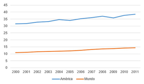 América en el año 2000 representó casi 842 millones o 14 por ciento de la población mundial. Desde entonces, aunque los números han incrementado a 991 millones en 2015, la participación de la región en el total ha bajado a 13.5 por ciento (Cuadro 1).