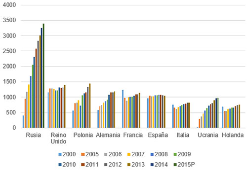 Figura 2. Ucrania, Rusia y Polonia han registrado los mayores crecimientos en Europa ('000 toneladas)