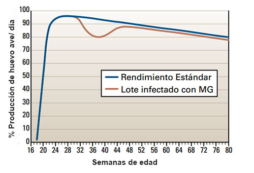 El síntoma más evidente de una infección de MG en un lote de ponedoras adultas es una baja prolongada en la producción de huevo (frecuentemente de 10-15%) ocurriendo durante un período de más de 4-6 semanas.
