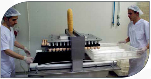 1 - La observación con ovoscopio, mover los huevos desde la bandeja a la cesta y apilar cestas/bandejas puede ser un proceso completamente automatizado.