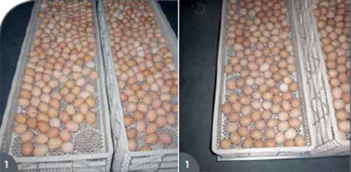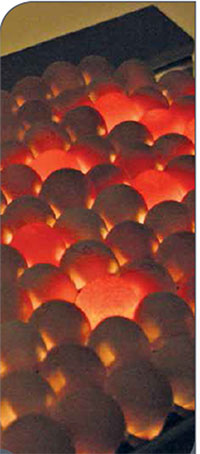 4 - Si la fertilidad está debajo del 80%, es conveniente alumbrar a todos los huevos, quitando los claros y entonces llenando los espacios vacíos para que el 90% de los espacios potenciales en las bandejas mantengan a los embriones vivos. Esto evita el desarrollo de puntos fríos debido a una carencia localizada del calor metabólico.