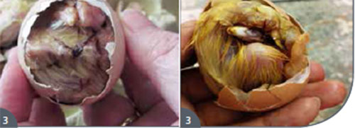 2 - Revise los residuos de incubación buscando roturas - esto es particularmente obvio porque habrá un embrión de 18 días el cual se ha desecado levemente, con membranas del cascarón blancas y gruesas.