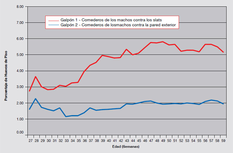 La cifra ideal de huevos de piso es cero, pero con cada parvada es razonable contar con que algunos huevos serán puestos en el piso. Si el nivel de huevos de piso es superior a 2-3% durante la vida de la parvada, existe un problema. La cantidad de huevos de piso es mucho mayor durante el inicio de la producción, pero hacia el pico de producción el nivel debe haberse reducido a 1-2%. Si la cantidad de huevos de piso es mayor, se deberán investigar los motivos e implementar las soluciones necesarias para resolver el problema.
