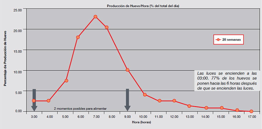 1. Suministrar alimento a las aves durante los primeros 30 minutos a partir del encendido de las luces, o 6 horas después del encendido de las luces. Evitar alimentar a las aves durante el período en el que se ponen la mayoría de los huevos. Nótese que en las instalaciones para aves de un día de edad hasta el sacrificio no debe haber diferencias entre las etapas de levante y de postura en cuanto a las horas de suministro del alimento.