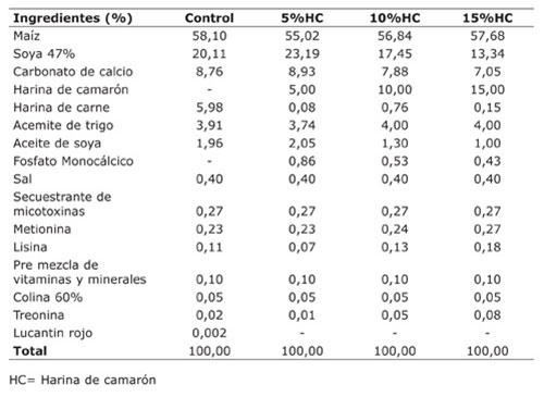 Los tratamientos consistieron en tres niveles de inclusión de la harina de camarón en la dieta, a razón de 5%, 10% y 15%, y una dieta control (sin camarón). Las dietas fueron formuladas de acuerdo con los requerimientos nutricionales de las aves según la línea genética, realizando la formulación con proteína ideal y aminoácidos digestibles para un consumo de 105 g/ave, además se mantuvieron isocalóricas e isoproteicas (18% proteína cruda y 2850 kcal).