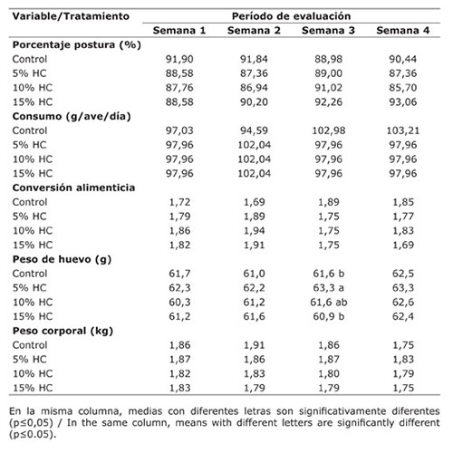 El periodo experimental fue de cuatro semanas, durante las cuales las variables estudiadas fueron: producción porcentual, consumo de alimento, peso corporal, mortalidad, peso de huevo y conversión alimenticia.