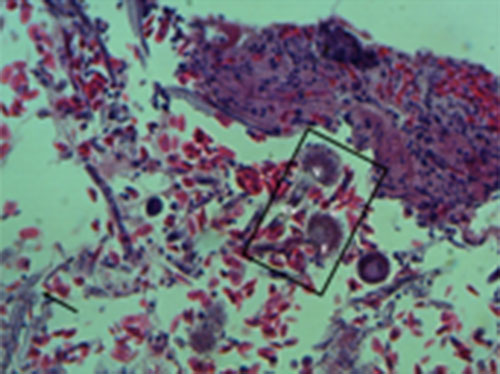 Corte histológico de pulmón teñido con hematoxilina-eosina en el que se observan hifas hialinas, septadas, con ramificación dicotómica en ángulo agudo (flecha) compatibles con aspergillus y cabezas conidiales (rectángulo) compuestos por conidios (C) fiálides (F) vesícula (V) y conidióforo (Co).