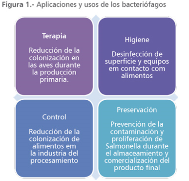 Los bacteriófagos tienen la ventaja de ser naturales, no tóxicos para las poblaciones microbianas de los animales y el hombre, y relativamente baratos. La utilización de preparados mixtos han sido probados con éxito variable, en algunos casos mostrando reducción en los niveles de contaminación en las aves y en el medio ambiente; en otros casos mostrando eficacia en aves desafiadas con cepas de Salmonella, o en aves contacto.