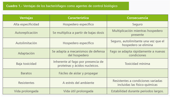 Los bacteriófagos ofrecen ventajas como agentes de control biológicos por muchas razones (Cuadro 1), entre ellas se pueden mencionar: Los fagos pueden ser líticos, lo que conlleva a la destrucción de la célula hospedera, o atenuados que pueden desarrollar además un ciclo lisogénico en el que el genoma del virus se integra al cromosoma bacteriano o se mantiene en el citoplasma de la célula como profago. En términos de “fagoterapia” es deseable que sean líticos para minimizar la transducción genética.