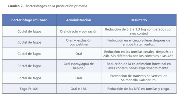 Los datos publicados de esta herramienta de control han mostrado buenos resultados por diferentes periodos, con fagos administrados como aditivos por la vía oral para un amplio espectro de salmonelas paratíficas, e inclusive para Salmonella Gallinarum en las aves (Cuadro 2). Aunque existen diferentes resultados, se ha sugerido que los tratamientos frecuentes con bacteriófagos, deberían ser realizados antes de la colonización intestinal por Salmonella para lograr una reducción en el tiempo, no obstante, el uso paralelo a la infección experimental o posterior también ha demostrado alguna eficacia en estudios controlados.