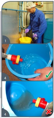4 Es buena idea realizar rutinariamente una evaluación visual del abastecimiento de agua durante toda la vida de la parvada. Simplemente deje correr agua del extremo de la línea y verifique si está clara. Si se puede visualizar un alto nivel de mugre, los métodos de saneamiento de la línea de agua no son los adecuados y deberán ser modificados.