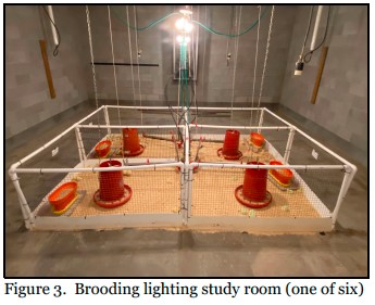 En el Centro de Investigación Avícola de la Universidad de Georgia se llevó a cabo un estudio preliminar que examinó los efectos de proporcionar a los pollitos un período de cuatro horas de oscuridad. Noventa y dos pollitos en cada una de las tres habitaciones comenzaron con 24 horas de luz y luego se les dio cuatro horas de oscuridad en la noche del día 7, mientras que los pollitos en tres habitaciones adyacentes recibieron cuatro horas de oscuridad desde el día en que fueron colocados.