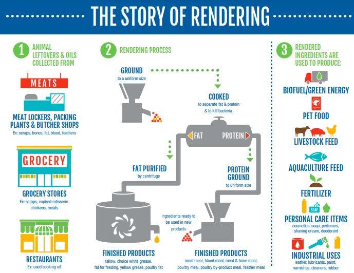 Starkey sostuvo que los estadounidenses solo comen el 50% de un animal, por lo que el procesamiento de renderizado recupera la carne que sobra y la transforma en alimentos nutritivos para mascotas y muchos otros productos.