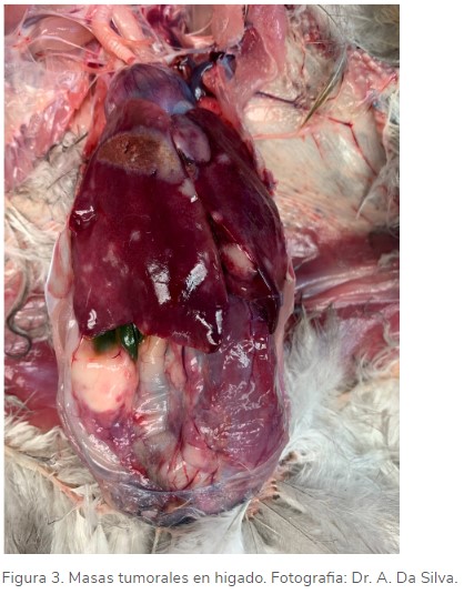 Los nervios ciáticos se observan comúnmente inflamados y con pérdida de las típicas estriaciones. Los nervios se encuentran engrosados de 2 a 3 veces el diámetro promedio, y posiblemente se observe una coloración amarillenta debido a edema de la superficie del nervio (Figura 2). Algunas aves presentan tumores viscerales (Figura 3), estos tumores pueden infiltrar múltiples tejidos y órganos (hígado, molleja, corazón, folículos plumosos, ojos, y nervios). En el caso de infiltración de hígado o bazo, se puede observar marcada hepatomegalia y esplenomegalia (Figura 4); un signo diferencial con otras neoplasias es que en Marek la bolsa de Fabricio nunca es afectada con tumores.