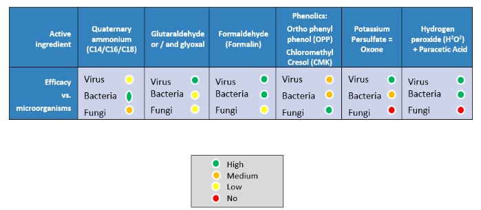Elección de desinfectante: son efectivos el glutaraldehído-amoníaco cuaternario; los oxidantes y los fenólicos si el tiempo de contacto es suficiente y se rocía una cantidad adecuada de desinfectante en todas las superficies. Es importante realizar una limpieza correcta y desinfección de la base de la pared porque esa zona de la pared está en contacto directo con los pollitos de un día, y los residuos de la cama pueden quedar sin limpiar. La actividad desinfectante reduce 5 logs de IBDV cada 30 minutos.