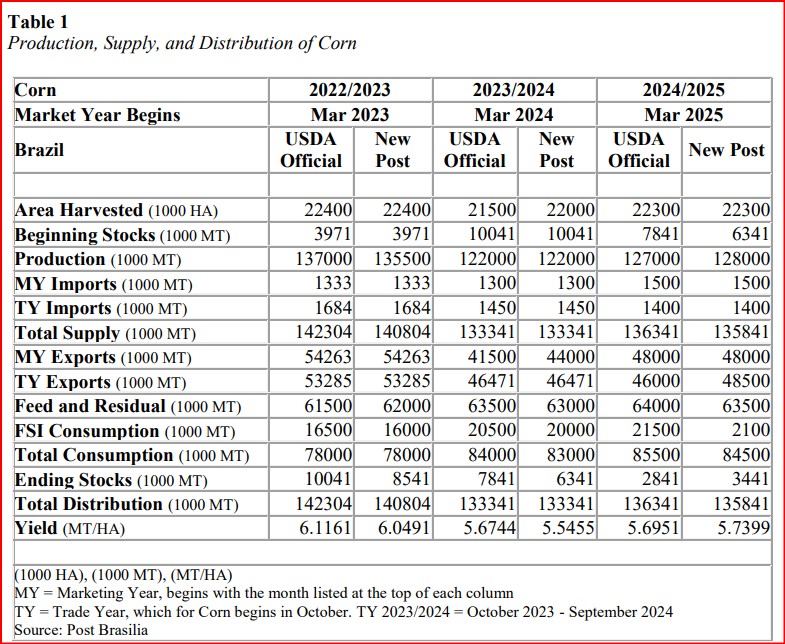 Al finalizar el fenómeno meteorológico de El Niño, que impactó severamente la producción de maíz en 2023/24, se espera que los rendimientos mejoren para 2024/25. Sin embargo, en Rio Grande do Sul, Minas Gerais y Goiás, se han registrado varios informes de efectos nocivos de la cigarra del maíz (Daubulus maidis), principalmente en áreas donde se establecen los llamados "puentes verdes", nombre que se da a aquellas áreas donde se planta maíz durante todo el año.