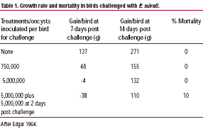 incidence, he says. Impaired weight gain, mortalityThe consequences of E. mivati infection in chickens were evaluated by Edgar from the 1960s to 1980s and by Fitz-Coy since the late 1980s. Three of several E. mivati field isolates from Georgia and the Delmarva area were used. For each evaluator, groups of birds were inoculated with varying amounts of E. mivati oocysts to evaluate for growth rate and mortality, and one group was not inoculated and served as a control.The more E. mivati oocysts that birds received, the worse the outcome. For instance, 14 days after challenge, birds that received the most oocysts had an average weight gain per bird of 110g (0.24 lb) compared to 271g (0.60 lb) in controls. None of the birds in the control group died, but in the group that received the strongest challenge, 10% died (see Table 1). In a subsequent study conducted by Fitz-Coy, inoculation of naïve birds using an E. mivati isolate from North Carolina yielded a mortality of 50%. There was no pathology in hatch mates immunized with E. mivati against the isolate. Pathologic changes