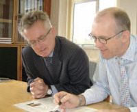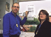 Shirley (right) reviews a report of the Eimeria genome project with Schering-