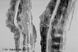 | Figure 33. These are cross-sections of the spinal column of 4-5-weekold broilers. The sample on the right is normal. That on the left shows the typical lesion of spondylolisthesis, with rotation of the body of the vertebra and the pinching of the spinal column that causes paralysis. |