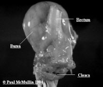 | Figure 23. This shows the anatomical relationship between the bursa, the rectum and the vent. This bursa is from an acutely affected broiler. It is enlarged, turgid and oedematous. |