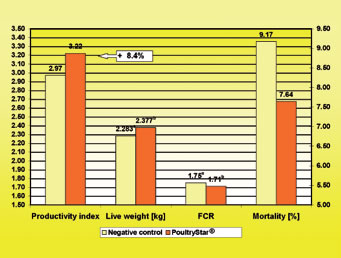 PoultryStar® – defined probiotic product – proves efficacyPoultryStar® is a well-defined, multi-strain Direct Fed Microbial (DFM) for poultry, and contains live, viable, naturally occurring microorganism (probiotics) which are categorized and classified as Generally Recognized As Safe (GRAS). PoultryStar® was developed in the course of a multinational reseach project partially funded by the European Union. In the course of the project numerous intestinal bacteria were isolated out of the gut of several healthy chickens and thoroughly characterized combining morphological, physiological and genotypic methods. The most promising strains were evaluated for important probiotic criteria such as adhesion capability to intestinal cell lines, inhibition of pathogens, (e.g. S. enteritidis, S. typhimurium, S. choleraesuis, C. jejuni, E. coli and Cl. perfringens), immunological activity, range of metabolic end products like Volatile Fatty Acids (VFA), fermentation performance, stability against acids and bile salts, storage stability and safety status. Based on these results a synbiotic product consisting of strains belonging to the genera Enterococcus, Pediococcus, Lactobacillus, Bifidobacterium and prebiotic fructooligosaccharides has been developed. PoultryStar® active ingredients Probiotic strains The probiotic strains (Direct-Fed Microorganisms) developed and patented by BIOMIN were thoroughly investigated in our laboratories and selected due to their probiotic features and their ability to maintain a healthy gut microbial population under challenging environmental conditions. The strains were isolated out of the gut of healthy chickens thus providing a rationale for their safe and efficient use as a feed additive for poultry. ![]() Prebiotic fructooligosaccharides The fructooligosaccharides are derived from a natural plant source of the family [compositeae] (Cichorium intybus) and were tested in our laboratories for their ability to selectively stimulate the growth of beneficial Bifidobacteria in the large intestine. The efficacy of PoultryStar® in improving performance parameters and reducing Salmonella in poultry has been confirmed in several feeding trials. In this Newsletter results of 2 recently conducted feeding trials are presented. ![]() Trial 1: Effect of PoultryStar® on broiler performance A trial was conducted at the Department of Poultry Science, Texas A&M University, USA. The aim of the trial was to investigate the effects of PoultryStar® on growth parameters of broiler chickens. Trial design The trial was conducted with straight-run, day-old broiler chicks (Cobb x Cobb) with 470 birds per treatment group and 10 replicates per group (one-way ANOVA base experimental design). Birds were reared on the floor for the full grow out period and placed on litter consisting of half used litter from a commercial broiler house and half fresh pine shavings. The ration fed to broilers in both trials was a standard corn-soy ration fed in a four diet feeding program (starter, grower, finisher, and withdrawal) that met exceeded NRC requirements. All diets fed were non-medicated feed and water was provided to all broilers ad libitum. Drinking water application of the product was by a medicator system in place within the grow-out house. Group 1 Negative control, no additive Group 2 PoultryStar® treatment, 20 g/1000 birds/day via drinking water on days 1-3, days 10-12, days 18-20 and days 30-32 The birds were kept under observation and performance parameters like live weight, body weight gain, feed intake, feed conversion ratio (FCR), mortality were determined at day 15, 30 and 40. Results The results are presented in Table 1 and Figure 1. Table 1. Efficacy of butyric acid glycerides on AMEn and growth performance in broilers