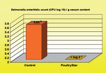 * PI (Broiler Productivity Index) = (Livability [%] x Liveweight [kg]/age [d]/FCR x 100 ![]() Figure 1: Performance parameters after 40 days Conclusion Broilers receiving PoultryStar® performed better in terms of body weight gain and feed conversion as compared to broilers in the control group. Specifically, body weights were significantly higher (P<0.05) on days 15, 30 and 40 when compared to the control group. Similarly, feed conversion was significantly improved (P<0.05) in broilers receiving PoultryStar® between days 1 and 40 when compared to broilers in the control group. Mortality was reduced in the trial group as well. Through the inclusion of PoultryStar® the broiler productivity index which summarizes all performance data was improved by 8.4%. The results of the trial show that PoultryStar® is effective in improving broiler performance. Trial 2: Effect of PoultryStar® on cecal colonization of Salmonella enteritidis in broiler chicken A feeding trial was conducted at the School of Agricultural and Veterinary Sciences, Department of Veterinary Pathology, Sao Paulo State University, Brazil. The objective of the study was to assess the efficacy of PoultryStar® to control intestinal colonization of chickens by Salmonella enteritidis. Trial design One-day old Cobb broiler chicks were provided by a commercial hatchery. At the moment of arrival they were inspected to ensure they were free of Salmonella. The birds were randomly assigned to the treatment groups (18 birds per group with 2 replicates) and reared in cages at isolation units. Food and water were given ad libitum. Birds were orally inoculated at age of 3 days with 0.1 ml Salmonella enteritidis (SE Nal/Spec) culture containing 1.0 x 106 CFU/ml. Group 1 Negative control, no additive Group 2 PoultryStar® treatment, 20 g/1000 birds on day 1, 2 and 3 via drinking water At day 5, 7 and 10 three birds out of each group were sacrificed and their cecal contents were cultured for Salmonella enteritidis. Results The results are presented in Table 2 and Figure 2. Table 2: Average number (CFU Log10) of Salmonella enteritidis (SE Nal/spec) in the cecal content of challenged birds treated with PoultryStar®