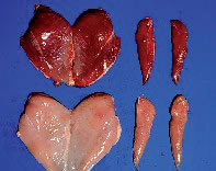 ![]() Figure 1. The ascitic (upper) and normal (lower) breast muscle of broiler Aetiology: The aetiology of ascites is very conflicting. Usually genetics have been blamed for the ascites. However, the breeding companies have improved genetic resistance of the stock to the ascites. The combination of environmental (ambient temperatures, high altitudes, stock density, air quality), nutritional (diet density, feeding type), hygienic (feed, environmental hygiene) and genetic events lead to this metabolic disease. A considerable number of ascites syndrome in broiler flocks is caused by microorganisms. Most of the Gram-negative bacteria (E. coli, Salmonella sp., Campylobacter) are considered pathogenic because of their lipopolysaccharide (LPS) layer. Some studies have shown that LPS triggers pulmonary vasoconstriction leading to ascites (pulmonary hypertension) in broilers (Chapman et al., 2005). Airborne LPS is ubiquitous in the environment of broilers, and is positively related to the amount of organic dust in poultry houses (Zucker et al., 2000). For example, respiratory exposure to E. coli can amplify the incidence of ascites five-fold in broilers. It is known that Salmonella typhiumurium may cause up to 79% mortality in one week old chickens. However, in some studies lesions of salmonellosis were reported for 4 to 6 week old broilers with E. coli co-infection consequentially leading to ascites (Ganapathy et al., 2000). Another pathogenic agent is a mould, Aspergillus fumigates, occasionally present in the environment of all poultry. Disease caused by this mould, so called ”brooder pneumonia”, forms mould colonies in the lungs, and produces hard nodular areas leading to air sac infection and subsequently to the development of ascites. Treatment and prevention of ascites: Firstly, it is important to understand the underlying causes of an ascites occurrence on a poultry farm. In the case of ascites caused by genetics, feed restriction might reduce the effect of the disease. Slower growing birds have reduced oxygen needs allowing the cardiopulmonary organs (heart and lungs) to keep up with oxygen demands of the birds. However, reducing the feed intake of broilers decreases the growth performance. Feed restriction is only of economic benefit when the incidence of ascites is very severe. In the case of ascites caused by microorganisms, recent studies investigating the effect of feed supplementation with acidifiers have shown promising results. Of course, optimal management practices are also very important for reducing the problem of ascites and maximising performance of broilers. The effect of the acidifier Biotronic® SE on ascites incidence on a commercial broiler farm (Bolivia) Trial design. Nine hundred day-old Cobb 500 male broiler chicks were divided into three groups. The birds were fed a corn-soybean meal diet. The Negative control group diet contained no feed additives, whereas the diet of the Positive control group was supplemented with an antibiotic growth promoter (AGP), and the trial group was supplemented with the acidifier Biotronic® SE (BIOMIN GmbH) at an inclusion rate of 1.5 kg/t feed. The duration of the trial was 46 days. The weight of the birds was recorded on days 14, 35, 42 and 46. Mortality and observations of the birds for abnormalities (diarrhea, depression, immobility) were carried out daily. Farm management. The trial was conducted on a commercial broiler farm 2600 metres above sea level in Bolivia. The mean external ambient temperature was 18 °C, and the humidity was 40%. The birds were vaccinated against Newcastle, Infectious Bronchitis and Infectious Bursal disease. Ascites incidence. Ascites incidence was characterized by clinical signs (panting, gurgling sounds, cyanotic combs and wattles, excessive abdominal fluid accumulation) and mortality rates. The incidence of ascites was confirmed by postmortem examination. Results and Discussion. For the initial 42 days, the broilers did not show any obvious clinical signs of ascites, even though on Day 35 mortality rates were recorded in the Negative control, Positive control and Biotronic® SE groups as 2.04, 3.09 and 2.39% respectively (Table 1). On Day 42 an outbreak of ascites was observed on the broiler farm with typical ascitic symptoms such as gasping, cyanotic combs and wattles, depression, extended abdomens, and increased mortality rates up to 7.53, 5.26 and 3.81% in the Negative control, Positive control and Biotronic® SE groups respectively. In the Biotronic® SE group, the mortality rate increased 37.27% over the mortality rate prior to the ascites outbreak, compared to 72.90 and 41.25% respectively in the Negative control and Positive control groups. Table 1. Effect of Biotronic® SE on body weight and mortality rate in broilers