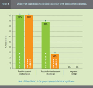 A coccidiosis vaccine sprayed on at 1 day of age yielded a vaccine take that was 60% higher compared to an in ovo coccidiosis vaccine, said Dr. Charlie Broussard, director of US technical services for Intervet/Schering-Plough Animal Health. The initial part of the study was conducted at a commercial hatchery in Maryland. Broiler chicks received Coccivac-B with a SprayCox II unit at 1 day of age, or an in ovo coccidiosis vaccine was administered to 19-dayold embryonated chicken eggs. Both vaccines contain live coccidial oocysts. The study also included three controls. One control group received no coccidiosis vaccine. The other two received an oral gavage of either Coccivac-B or the in ovo vaccine to demonstrate the effectiveness of both vaccines when a sure-fire method of administration is used. After vaccination of birds that received Coccivac-B and after hatch of the in ovo group, birds in each group were independently segregated to ensure they were not infected with oocysts from hatch-mates, he said. Investigators measured first-cycle output to determine the effectiveness of the vaccine-administration methods. For this part of the study, they individually numbered and tagged the birds before moving them to segregated units at the University of Delaware’s Lasher Lab, where Drs. Dan Batista and Miguel Ruano microscopically analyzed feces. “If one or more coccidial oocysts could be identified on any day of the trial period, which was 5 to 8 days post-hatch, then the bird had a positive vaccine take,” Broussard said in an interview after the meeting. The group sprayed with Coccivac-B on the day of hatch had a vaccine take of 88%, compared to 28% in birds that received the in ovo vaccine, he said (Figure 1). ![]() As expected, vaccine take was 100% in birds that received either Coccivac-B or the in ovo vaccine by oral gavage. None of the unvaccinated control birds shed oocysts. Why was vaccine take so much better for spray vaccination than in ovo administration? “In ovo administration of a coccidiosis vaccine is a lot more difficult,” Broussard said. With in ovo coccidiosis vaccines, live coccidial oocysts need to get to a certain area in the egg where they can be swallowed, then move to the gut, where they infect intestinal epithelial cells and initiate immunity. In addition, unhatched birds don’t have digestive enzymes at work to break up and aid the digestion of oocysts releasing the infective sporozoites, he explained. “With other types of vaccines, such as viral vaccines, it doesn’t matter whether you give them in ovo, subcutaneously or intramuscularly — you achieve your goal. The margin of success is just a lot better than it is when compared to a coccidiosis vaccine,” he said. ![]() PUTNAM: ‘Living on the edge’ with coccidiosis control