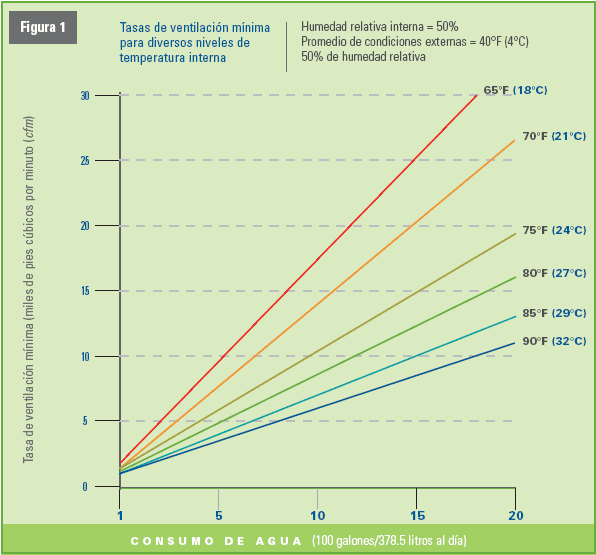 de 40°F. La tasa mínima de ventilación que se determine mediante esta gráfica se deberá considerar como punto de partida y se deberá aumentar o disminuir de acuerdo con diversos factores como por ejemplo el tipo de agua que se utilice y qué tan hermética sea la construcción