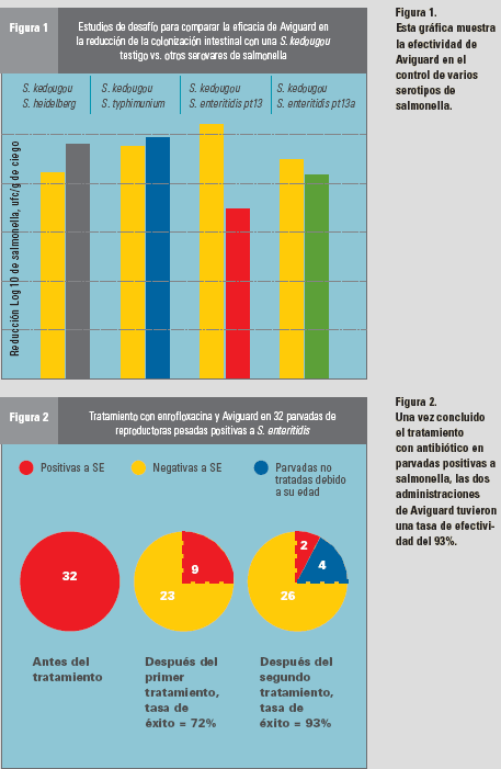 salmonella. En un estudio que describió, Aviguard fue efectivo en la reducción de múltiples serotipos de salmonella además de S. kedougou, que se utiliza en la prueba estándar de eficacia (Figura 1). "En el campo hemos visto la eficacia del producto contra muchos más serotipos diferentes de salmonella".