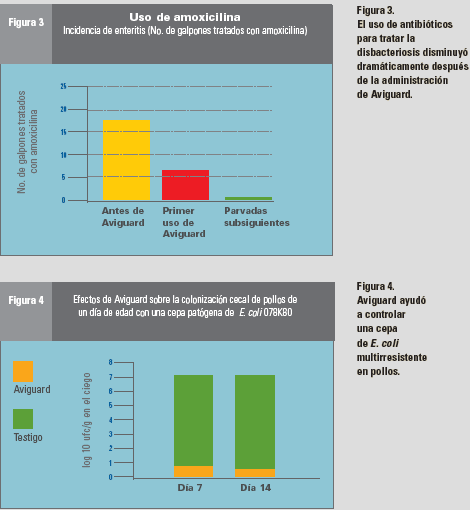 producto en el pollo de engorde, al tiempo que redujo considerablemente el nivel de amoxicilina. Obtuvo un mejoramiento después de usar Aviguard por primera vez, pero después de tres o cuatro dosis no se presentó enteritis en lo absoluto y no fue necesario usar antibióticos (Figura 3). Este productor continúa usando Aviguard y no ha vuelto a detectar enteritis ni ha usado antibióticos desde octubre del 2005.