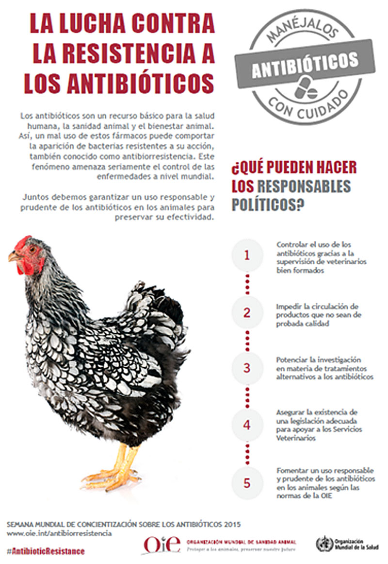 En la línea de la fructífera colaboración entre los sectores de la salud humana y de la sanidad animal en esta materia establecida en el marco de la campaña de la OMS "Antibióticos: manéjalos con cuidado", se han elaborado varios pósteres junto con la OMS y la Organización de las Naciones Unidas para la Alimentación y la Agricultura (FAO), que pueden consultarse en el portal de la OIE.