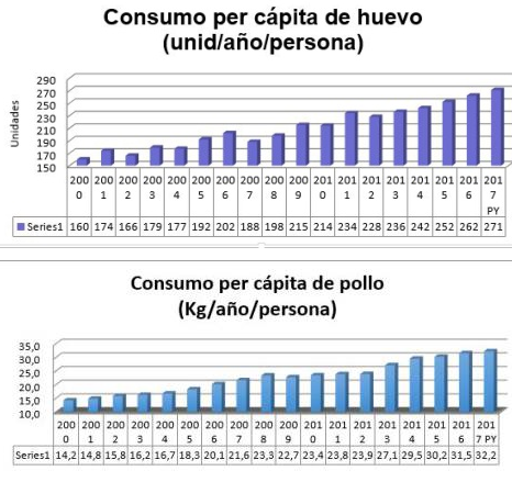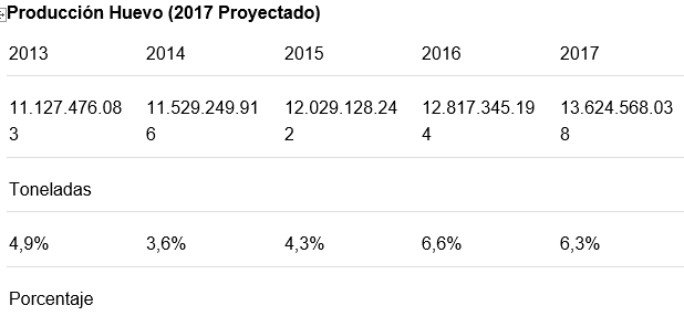 Durante el primer semestre de este año 2017 se tuvo un crecimiento del 4.9%. La producción de Pollo y Huevo fue de 1.158.496 toneladas, 53.729 más que en el 2016 el cual fue de 1.104.768. De enero a junio, la producción de Pollo llegó a 758.310 toneladas y la de Huevo 400.189 toneladas representadas en 6.669 millones de unidades. Para el caso de la producción de carne de Pollo, el crecimiento semestral fue de 4.9%. Para el caso de huevo se registró un incremento de 4.8%.