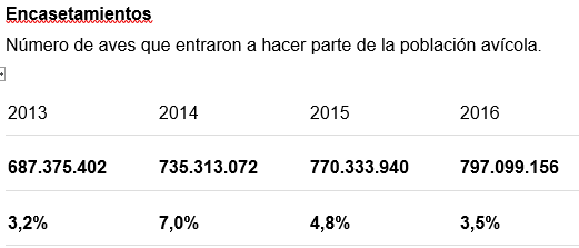 Asimismo, durante el semestre de 2017, el encasetamiento o número de aves que entraron a hacer parte de la población avícola, alcanzó un incremento del 2,8% frente al mismo periodo de 2016, superando los 396 millones de aves alojadas; representadas en 22.5 millones de pollitas, y 373.5 millones de pollitos. A junio de 2016 el encasetamiento fue de 385.2 millones de aves.
