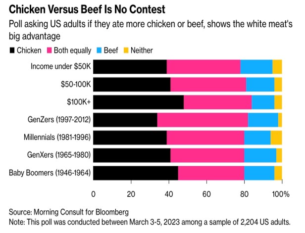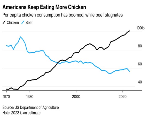 La económica y asequible carne de pollo, tres veces más barata que la carne de res, y su versatilidad, le dan una ventaja sobre la carne de res. Su popularidad ha aumentado considerablemente debido a su uso en la cocina casera, alimentos procesados y restaurantes. A pesar de las preocupaciones ambientales y de salud relacionadas con la carne de res, la industria de la carne de res ha luchado por cambiar su marca e innovar.