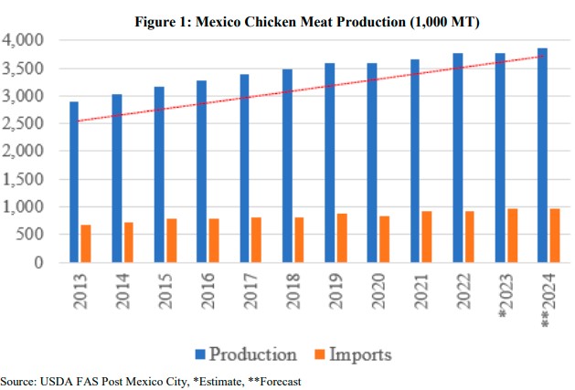 A nivel mundial México es actualmente el sexto productor de carne de pollo y satisface cerca del 80 por ciento del consumo nacional. En los últimos diez años, la producción nacional de carne de pollo ha crecido más del 30 por ciento. Si bien las importaciones aumentaron un 45 por ciento durante el mismo período, han seguido representando el 20 por ciento del consumo interno, lo que indica que el crecimiento de las importaciones seguirá estando vinculado y limitado por el crecimiento del consumo general. La competitividad de México como productor avícola está impulsada por la disponibilidad de mano de obra local y el acceso a un suministro a precios competitivos de abundantes granos forrajeros y oleaginosas, coproductos como los granos secos de destilería con solubles (DDGS) y otros insumos, incluida la genética avícola de los Estados Unidos.