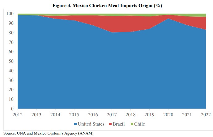 Según datos comerciales actualizados, las importaciones de 2023 se estiman un siete por ciento más que las de 2022, con 975.000 toneladas. Una apreciación de nivel récord del peso mexicano en relación con el dólar de los Estados Unidos, fortalece las perspectivas de importación de aves. Estados Unidos sigue siendo el principal socio comercial avicola de México, a pesar de que se estiman mayores importaciones desde Brasil. Las importaciones de cortes de pollo procedentes de Brasil, que requieren más mano de obra y a precios competitivos, han aumentado en los últimos diez años. En 2022, cerca del setenta por ciento de las importaciones brasileñas de aves fueron carne de pechuga de pollo deshuesada.
