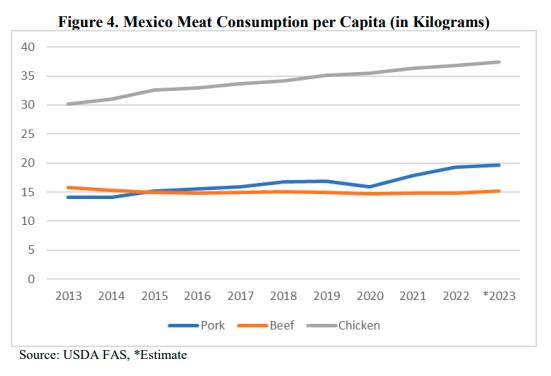 Se pronostican exportaciones de 5,000 toneladas en 2023, un 60 por ciento menos que en 2022. Los datos comerciales de México muestran envíos limitados en la primera mitad del año y se espera que la demanda estadounidense se mantenga débil durante el resto de 2023. Las exportaciones de México a Estados Unidos fueron más fuertes en 2022 a medida que la demanda aumentó debido al impacto de la IAAP.